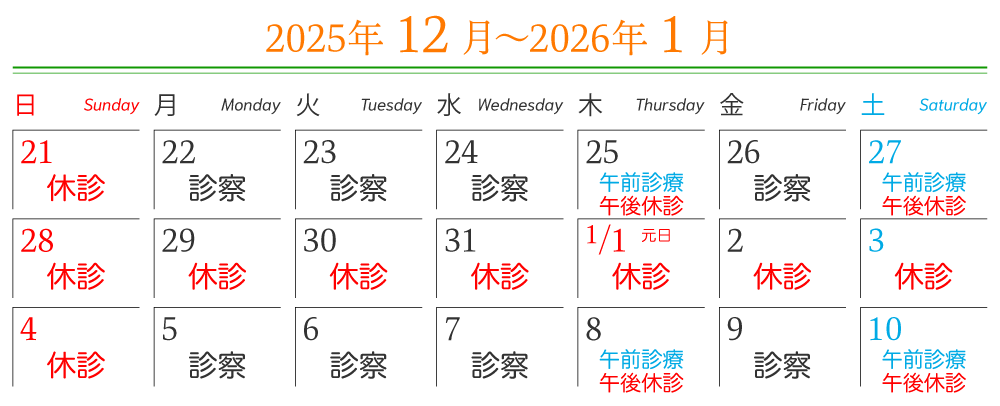 HOME お知らせ 年末年始の休診のお知らせ:2025年12月28日から2026年1月4日まで 2025年12月5日 2025年12月28日から2026年1月4日まで休診となります。皆様にはご不便をおかけいたしますが、ご了承いただけますようお願い申し上げます。